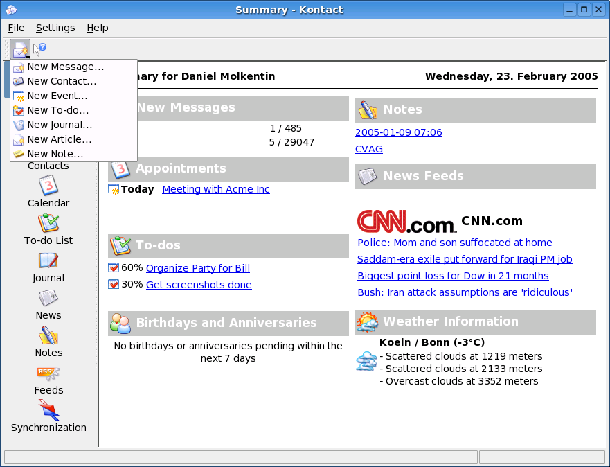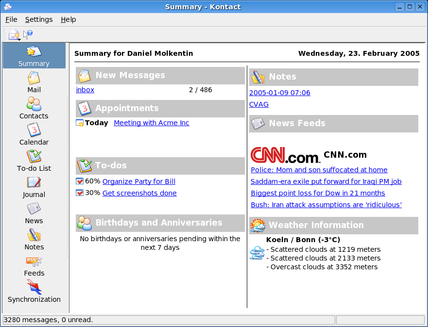 Kontact — это интегрированное решение по управлению вашей персональной информацией (PIM). Он объединяет известные приложения KDE, такие как KMail, KOrganizer и KAddressBook в один интерфейс для предоставления простого доступа к почте, органайзеру, адресной книге и другим функциям PIM.